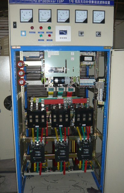 研制生产的高低压无功补偿谐波滤除装置。适用于冶金,化工,纺织,通讯机房设备等的环境。该装置采用了动态过零投切元件,电感和电容器组成串联谐振吸收回路,有效的将负载产生的谐波加以吸收,从而避免将谐波电流返送到电力变压器,大大降低电网的谐波量,同时有利于用户电力变压器的运行,降低功耗,提高设备和其它电器组件的可靠性。此外该设备还提供一定容量的无功功率补偿,提高用户负载的运行效率。系统的操作可分自动运行和手动操作。